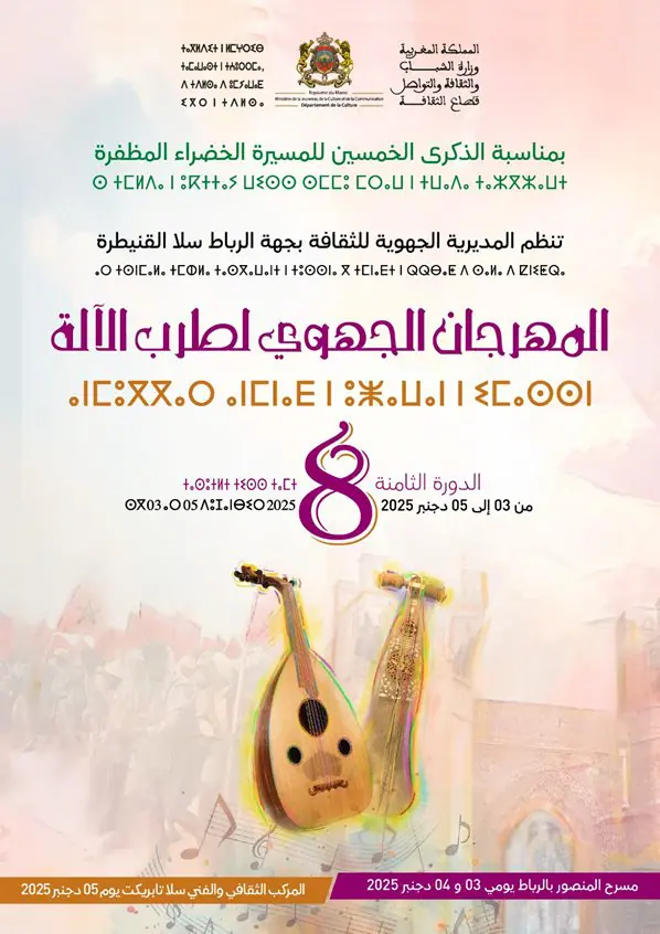تخليدًا للذكرى الخمسين للمسيرة الخضراء المظفرة تنظم وزارة الشباب والثقافة والتواصل، الدورة الثامنة للمهرجان الجهوي لطرب الآلة، وذلك خلال الفترة الممتدة من 03 إلى 05 دجنبر 2025 بمدينتي الرباط وسلا. وتندرج هذه التظاهرة الفنية ضمن برنامج الاحتفاء بقيم المسيرة الخضراء ورمزيتها التاريخية والوطنية، وكذا في إطار تعزيز الإشعاع الثقافي لجهة الرباط – سلا– القنيطرة وصون التراث المغربي اللامادي، وخاصة فن طرب الآلة باعتباره مكونا فنيا أصيلا متجذرا في الهوية المغربية.