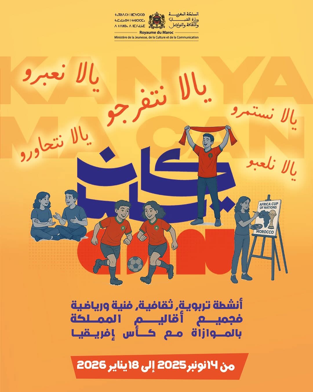 ويرتكز برنامج “كان ياما CAN” على تفعيل مؤسسات ودور الشباب بعدد من جهات المملكة، من خلال تنظيم باقة متنوعة من الأنشطة الرياضية والثقافية والفنية، تشمل دوريات محلية في كرة القدم، وبطولات في الألعاب الإلكترونية، إلى جانب ورشات فنية في الرسم والتعبير التشكيلي، ومسابقات إبداعية تستلهم رمزية كأس إفريقيا للأمم وقيمها الجامعة.